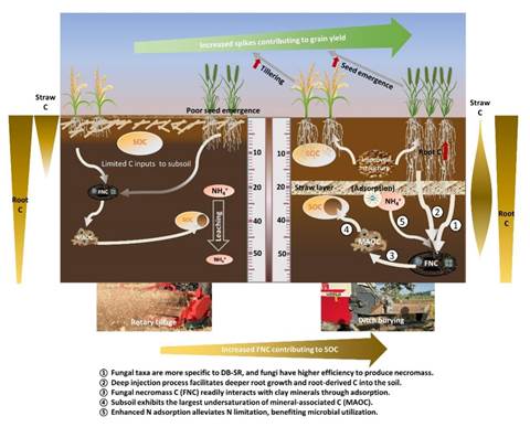 秸秆集中沟埋作为一种新型的保护性土壤耕作培肥措施,能够渐进式增加耕层厚度并实现秸秆深埋全量还田,保证作物正常出苗、立苗;即使在未来高产条件下,也能实现秸秆全量还田(按当前生产水平1.5倍量以上计)和稻麦安全稳定生产。经过连续多年田间定位试验发现,与主流的旋耕还田相比,经过15年的秸秆集中沟埋还田在不增加肥料投入前提下,通过增加穗数提升产量15%;显著增加10-40 cm土层有效氮含量从而降低碳氮比,促进秸秆碳向矿物结合态真菌残体的高效转化,最终大幅增加0-40 cm土层土壤有机碳储量高达46%(17.2 Mg ha⁻¹)(图1)。通过生命周期系统评估显示,秸秆集中沟埋还田使稻麦系统净CO₂当量排放降低34%,净经济效益提高18%。通过整合分析全国区域性短期试验数据,进一步验证了该技术对土壤碳固存与作物产量的协同强化具有普适性。因此,基于秸秆几周沟埋还田的深土管理可以最大限度地减少土壤干扰,通过增加土壤稳定碳固存和作物产量来提高农业生产的可持续性。