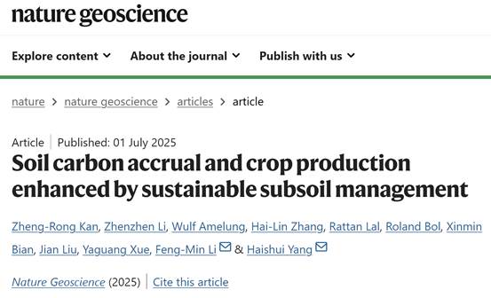 《Nature Geoscience》发表耕作制度与农田生态创新团队“Soil carbon accrual and crop production enhanced by sustainable subsoil management”