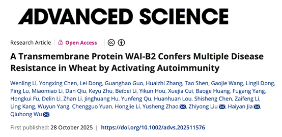 论文链接:Li W., Chen Y., Dong L., et al. (2025) A transmembrane protein WAI-B2 confers multiple disease resistance in wheat by activating autoimmunity. Advanced Science e11576. https://doi.org/10.1002/advs.202511576