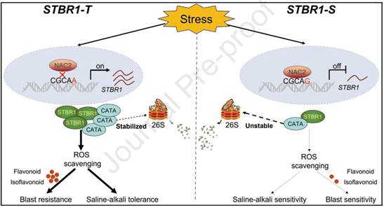 近日,ios版雷竞技官网万建民院士团队在Plant Communications(影响因子IF5-2024=11.8)在线发表了题为“A BAHD acyltransferase STBR1 confers both saline-alkali tolerance and blast resistance by stabilizing the non-canonical catalase CATA to promote H2O2 scavenging in rice”的研究论文。该研究鉴定出编码BAHD酰基转移酶的STBR1基因,发现其作为关键调控因子赋予水稻对盐碱胁迫和稻瘟病的双重耐受性。STBR1蛋白与过氧化氢酶CATA发生物理相互作用并稳定其活性,从而促进H₂O₂清除并保护细胞免受氧化损伤。此外,研究人员鉴定出天然优势单倍型STBR1-T,其启动子突变可削弱转录抑制因子NAC2的结合,从而提升STBR1表达水平,使水稻同时表现出盐碱耐受性和稻瘟病抗性。本研究阐明了NAC2-STBR1-CATA模块作为核心枢纽,在非生物与生物双重胁迫下协调氧化稳态的作用机制。优异等位基因STBR1-T为培育兼具强抗逆性与广谱抗性的水稻高产品种提供了宝贵的遗传资源。