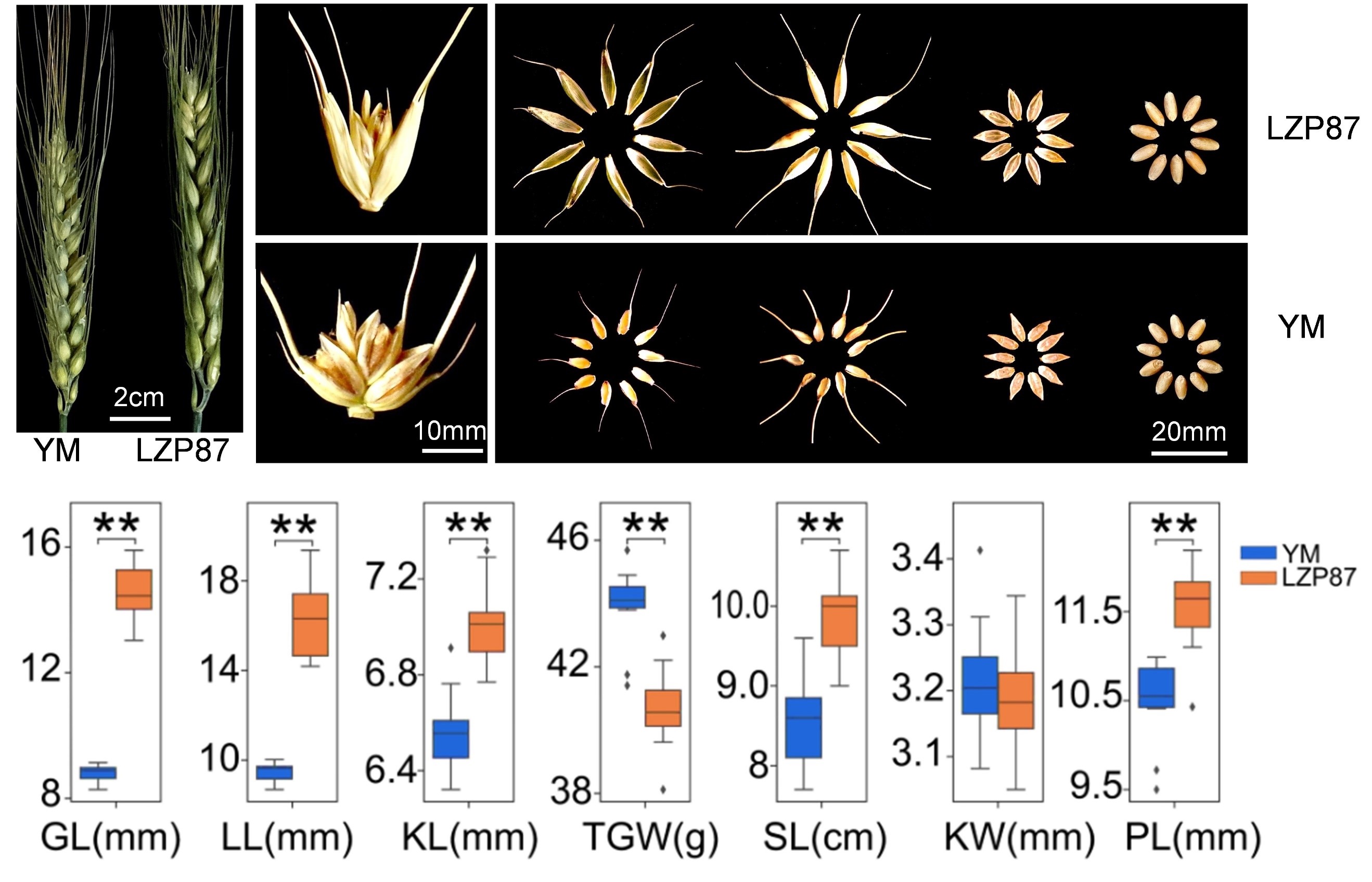 图5 携带P1的CSSL系LZP87和扬麦158穗部性状比较