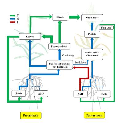 提高氮素利用效率(NUE)以降低氮素投入而改善农业环境并节约生产成本是实现小麦可持续生产的主要目标。然而,AMF是否及如何影响小麦NUE目前并不清楚。本研究首先提出了概念模型(图1),并设计了3个独立且互补的试验进行阐明根系和AMF对小麦氮素吸收和转化利用上的贡献。