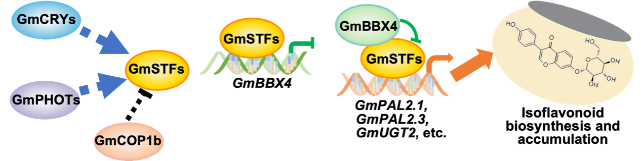 结合遗传学、生理学和分子生物学等实验证明:UV-A和蓝光受体GmCRY1s、GmCRY2s、GmPHOT1s、GmPHOT2s以及转录因子GmSTFs促进大豆异黄酮的生物合成,而E3泛素连接酶GmCOP1b负调控大豆异黄酮的积累。GmPHOT1s和GmPHOT2s正调控GmSTFs的蛋白丰度,而GmCOP1b负调控GmSTFs的蛋白积累。通过RNA-seq实验发现GmSTFs调控了大豆中约27.9%异黄酮生物合成相关基因的转录表达。苯丙氨酸解氨酶是异黄酮生物合成途径的关键限速酶之一,而糖基转移酶催化游离型的异黄酮苷元转化为结合型的异黄酮糖苷。生化分析表明,GmSTFs直接结合苯丙氨酸解氨酶GmPAL2.1、GmPAL2.3和糖基转移酶GmUGT2等异黄酮合成相关基因的启动子区域,促进其转录表达。B-box蛋白GmBBX4负调控大豆种子异黄酮的生物合成和积累。在转录水平上,GmSTFs直接结合在GmBBX4的启动子上,进而负调控其转录水平。在蛋白水平上,GmBBX4与GmSTFs相互作用,并抑制GmSTFs对异黄酮合成相关靶基因的转录激活能力。因此,GmSTFs作用于光受体的下游,与GmBBX4形成负反馈回路,共同调节大豆种子中异黄酮的生物合成和积累。该研究为培育高异黄酮含量的大豆新品种(系)提供了重要的理论基础、种质和基因资源。