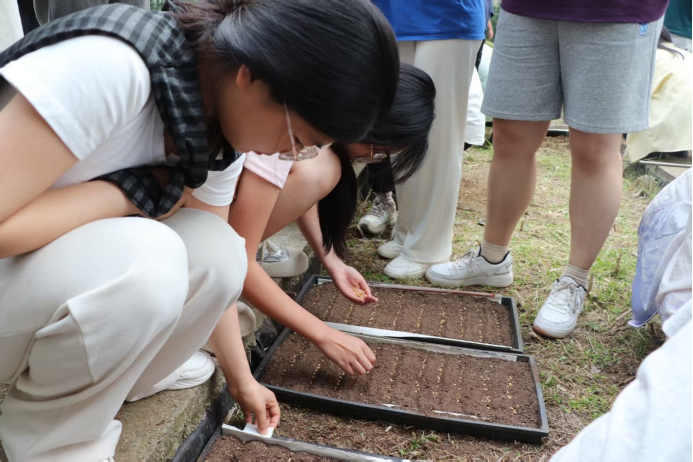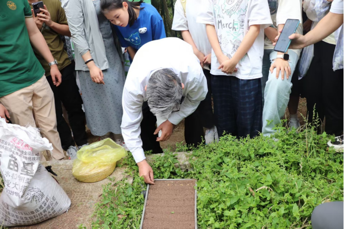 示范结束后,各班立即投入到播种实践中。各班同学代表分工合作,按照洪教授的示范步骤,在秧盘底部铺好报纸,依次完成覆土、划线、播种等工作。在灌溉过程中,同学们产生了技术分歧针对喷壶直接喷洒是否会导致水分蒸发过快的疑问,洪教授及时给予专业指导:建议大家挖一个小水坑,将秧盘置于湿润的土坑中,这样既能保证水分供给,又能有效减少蒸发。通过这次实践,同学们不仅掌握了播种流程,更深刻认识到农业生产中技术细节的重要性。