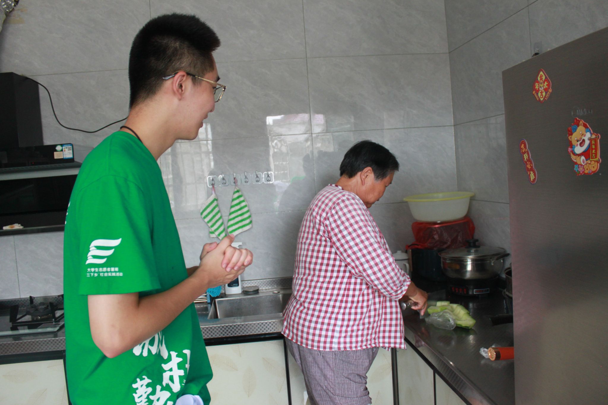 调研尾声,团队踏入一户正在用餐的老人家中。老人不仅耐心配合访谈,分享生活点滴,临别之际,奶奶更亲手切开清甜的瓜果热情招待。这份来自乡土最质朴的温情,深深浸润了每位成员的心田。