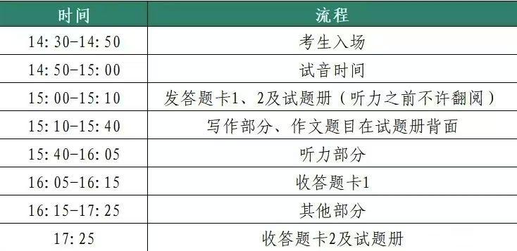 ①带齐身份证件,包括准考证、身份证;②带齐文具用品(2B铅笔、橡皮、黑色签字笔);③准备好听力耳机,提前调频;④考试过程中严格按照监考老师的指令答题,不得提前翻阅试卷、提前答题等。