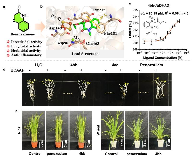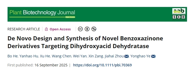 近日,叶永浩教授课题组联合中国科学院上海有机所/南京师范大学周佳海教授课题组,在Plant Biotechnology Journal期刊上在线发表了题为“De Novo Design and Synthesis of Novel Benzoxazinone Derivatives Targeting Dihydroxyacid Dehydratase”的研究论文。该研究基于新型除草剂作用靶标——二羟酸脱水酶(DHAD),发现苯并噁嗪酮分子骨架能够靶向DHAD,表现出广谱且高效的除草活性,同时对水稻和小麦具有较高的安全性,验证了DHAD作为新型除草剂靶标的可行性。此外,该类衍生物在植物与微生物间显示出良好的选择性,对哺乳动物细胞无显著抑制活性,安全性良好,为开发具有全新机制的绿色除草剂提供了理论依据。