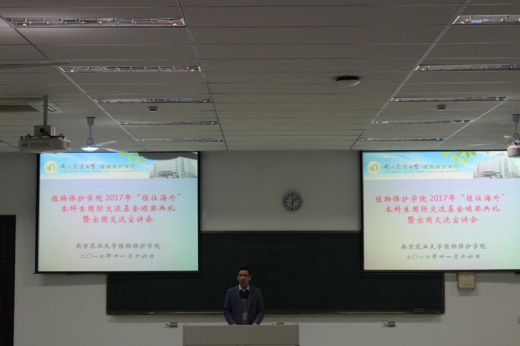 2017年11月16日,下午六点,植物保护学院于主楼143举办2017年“植往海外”本科生国际交流基金颁奖典礼暨出国交流宣讲会。本次到场的嘉宾有国教院副院长童敏、植保院党委副书记黄绍华、植保院09年优秀校友Wonder Education校长李珂,以及植保院的辅导员和部分本科生。