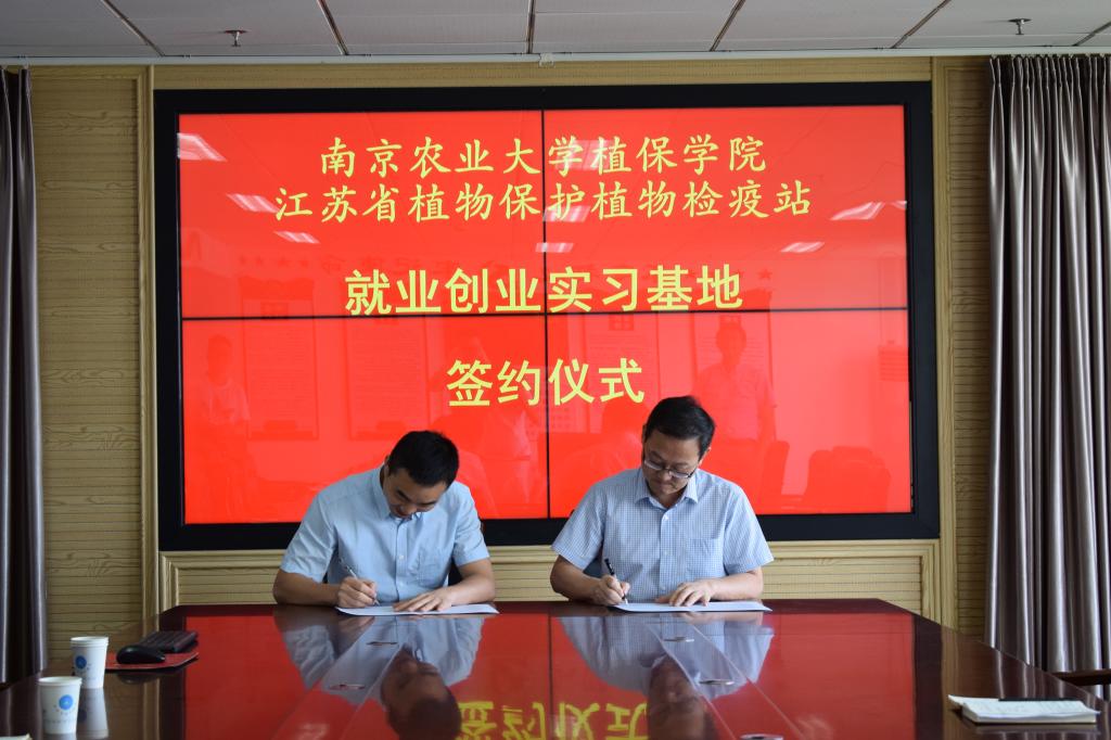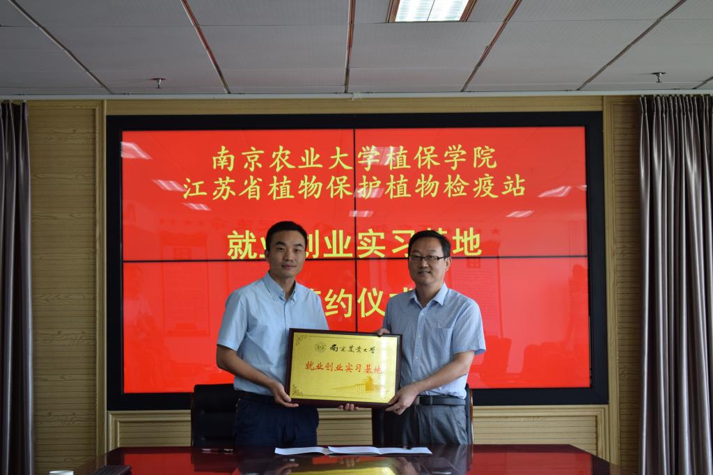 2019年7月30日,ios版雷竞技官网植物保护学院王兴亮副院长,李子成辅导员和4名本科生一行6人赴江苏省植物保护植物检疫站,与植保站主要负责人座谈交流,并举行 “就业创业实习基地”签约授牌仪式。