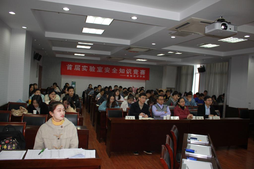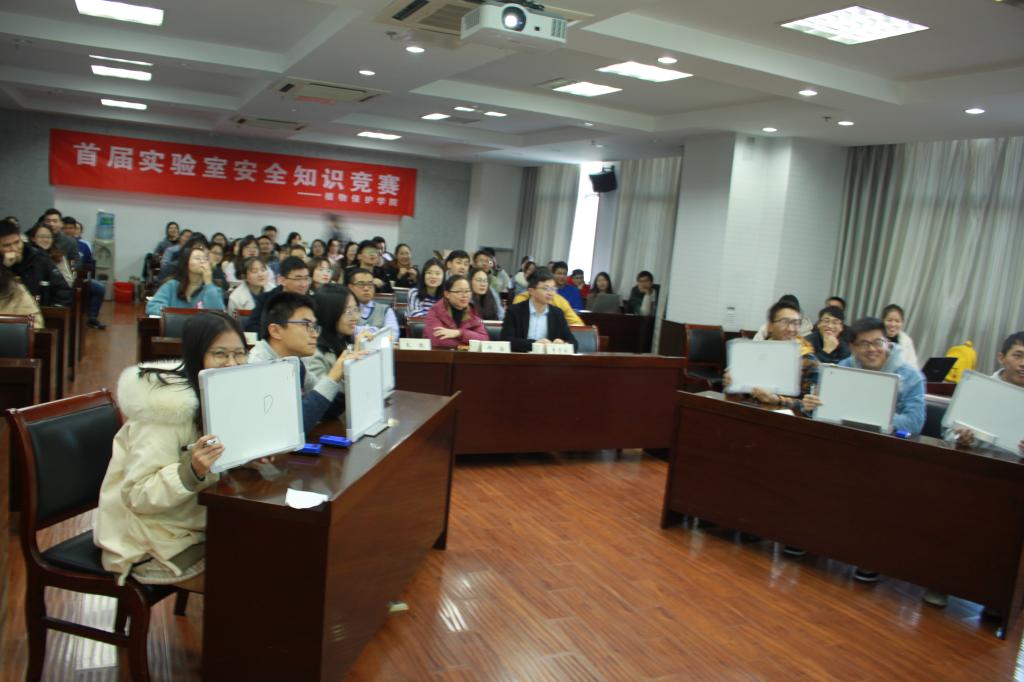 11月29日下午,植物保护学院在理科楼C303举办了“首届实验室安全知识竞赛”活动。此次竞赛邀请了学院副院长王兴亮、公共实验平台老师郑颖、科研秘书朱凯、研究生辅导员李子成和安全秘书罗舜文五位老师出席。参加活动的研究生涵盖了全院所有课题组,共有24支代表队参与比赛。