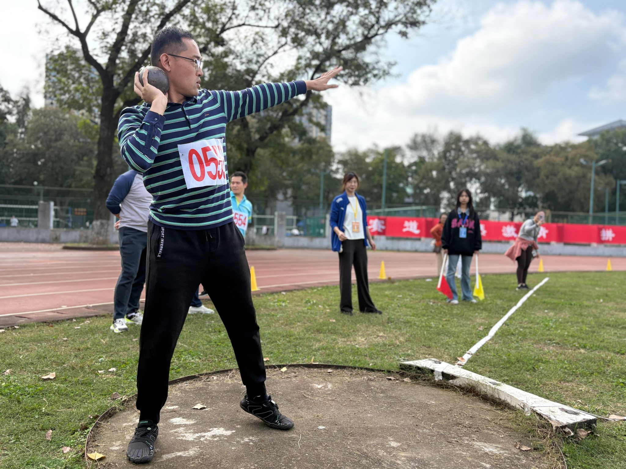 铅球、实心球赛场,选手们鼓足干劲,将沉重的球奋力抛出,在空中划出一道道优美的弧线。