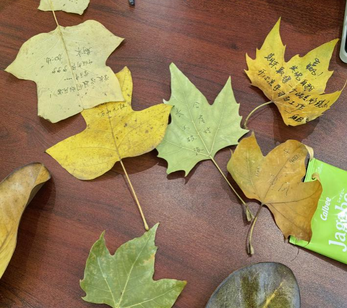 同学们围坐一起,把工作困惑、学习迷茫摊开聊 —— 不同班级的经验碰撞,擦出不少新思路~最浪漫的是 “秋日限定环节”:把对未来的期许写在泛黄落叶上,一笔一划都是青春的郑重,迷茫也悄悄变成了 “踏实向前” 的底气。