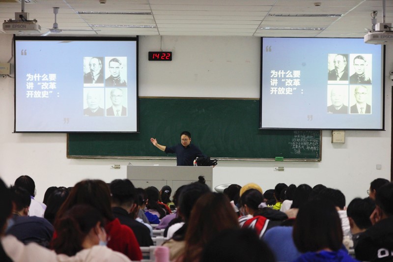 杜老师从自身经历出发以“为什么讲四史、改革开放的背景、改革开放以来农村经济变迁、改革开放以来农村的‘政治’变迁、总结农业农村现代化”五块内容展开。讲解环环紧扣、举例贴切,将改革开放在农村的四十年细细展现。同学们聚精会神,听得津津有味。