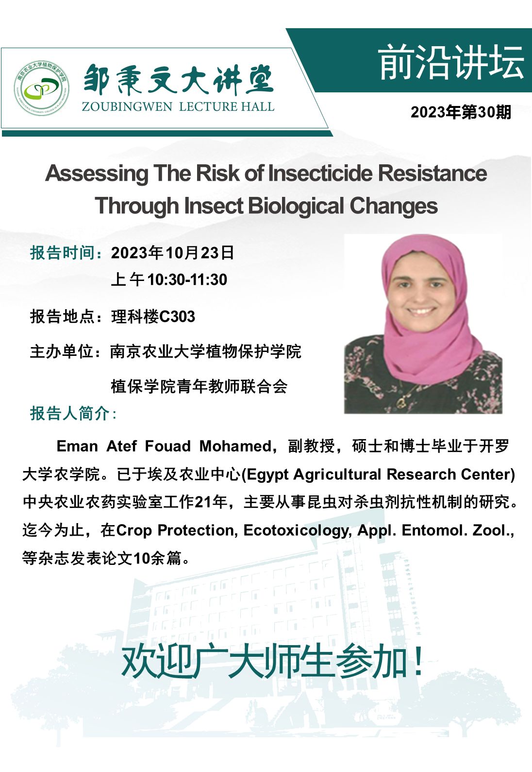 邹秉文大讲堂之前沿讲堂—Assessing The Risk of Insecticide Resistance Through Insect Biological Changes