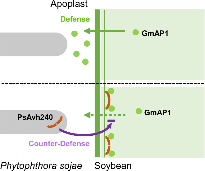 大豆疫霉引起的疫霉根腐病是大豆生产上的主要病害之一,在全球范围内分布广、危害重。ios版雷竞技官网作物疫病研究团队长期聚焦于大豆与疫霉菌的分子互作,以病原菌的致病因子---效应子为分子探针(Plant Cell, 2011),就植物在胞内和胞外对病菌免疫的分子机制进行了系统的研究,为改良作物的广谱抗病性提供了系列具有自主知识产权的重要基因资源(Current opinion in Microbiology, 2018)。在胞外免疫的研究中,该团队此前发现疫霉菌在侵染早期可以分泌糖基水解酶XEG1攻击大豆细胞壁(Plant Cell, 2015),为应对寄主蛋白酶抑制子GIP1的作用,病原菌又进化出XEG1酶活缺失突变体XLP1,以“诱饵模式”协同攻击植物的免疫系统(Science, 2017);而植物又可以利用膜上免疫受体RXEG1识别并抵抗XEG1的攻击(Nature Communications,2018)。此次发现的疫霉菌效应子Avh240对大豆胞外免疫蛋白酶GmAP1的攻击方式,将病原菌与植物的“军备竞赛”上升到了一个新的层次,揭示了病原菌与植物互作关系的复杂性。