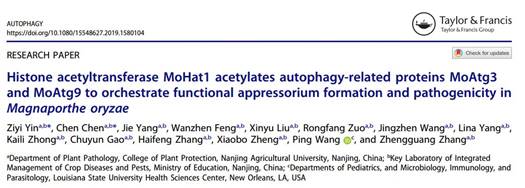 近日,细胞生物学领域的权威期刊“Autophagy”(5年影响因子11.8)在线发表了我校关于组蛋白乙酰转移酶介导细胞自噬控制稻瘟病菌的功能性附着胞形成和致病力的研究论文“Histone acetyltransferase MoHat1 acetylates autophagy-related proteins MoAtg3 and MoAtg9 to orchestrate functional appressorium formation and pathogenicity in Magnaporthe oryzae”。该论文第一署名单位为ios版雷竞技官网,第一作者为我校植保学院博士生尹梓屹和硕士生陈辰,我校张正光教授为通讯作者。我校郑小波教授、张海峰教授与美国路易斯安娜州立大学的Ping Wang教授参与了该研究。