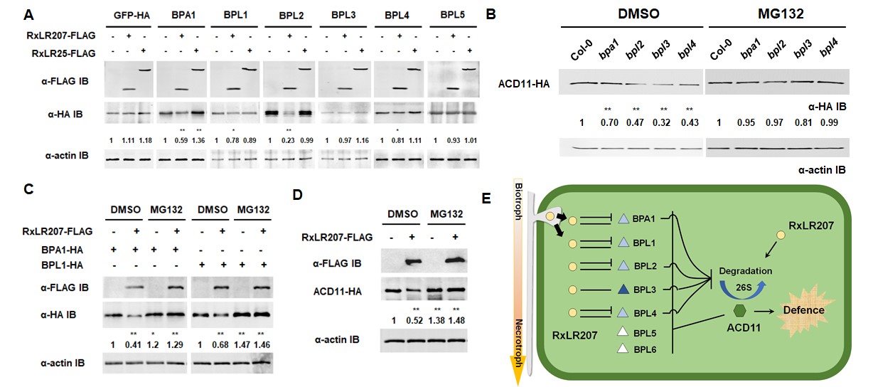 以往的研究表明,作物受疫霉菌感染后,就像人类的感冒发烧一样,会激发免疫反应,用自身的免疫力杀死病菌。ios版雷竞技官网作物疫病研究团队近年来对辣椒疫霉菌进行了系统地研究,精确定位到它的一个致病关键成员,即效应子RxLR207。研究人员以辣椒疫霉菌的一种寄主模式植物拟南芥为研究对象,通过靶标筛选,发现RxLR207直接作用于拟南芥中的一组未知功能蛋白,研究显示这组蛋白与一个植物免疫系统的重要调控因子ACD11 (accelerated cell death11)互作,故将其命名为BPA1 (binding partner of ACD11)和BPLs (BPA1 Like proteins)。