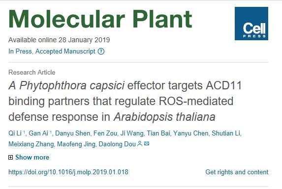 该研究结果以”A Phytophthoracapsici effector targetsACD11 binding partners that regulate ROS-mediated defense response in Arabidopsis thaliana”为题近日在国际知名学术期刊《分子植物》(Molecular Plant)上发表。博士后李琦与博士生艾干为论文第一作者,窦道龙教授为通讯作者,景茂峰和张美祥两位副教授也参与工作。该研究得到了国家杰出青年科学基金和国家自然科学基金创新研究群体等项目的资助。