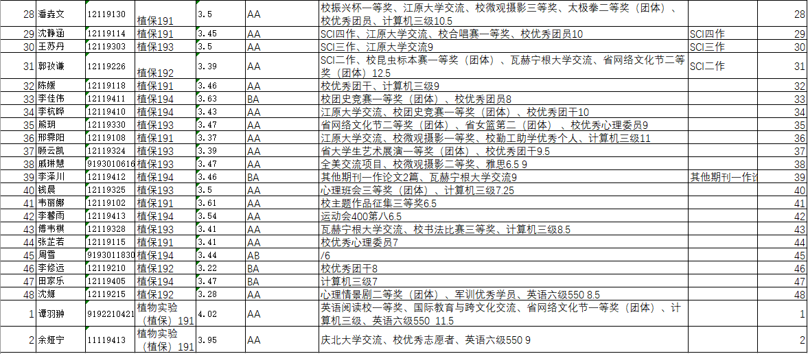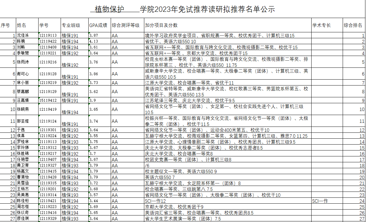 根据《ios版雷竞技官网关于做好2023年推荐优秀应届本科毕业生免试攻读研究生推荐工作的通知》文件精神,经学生自愿申请,学院初步审核以及资格认定答辩,依据《植物保护学院2023年推荐免试研究生(含“直博生”)工作方案》综合排名,现将最终拟推荐名单公示如下(按综合成绩排名排序):