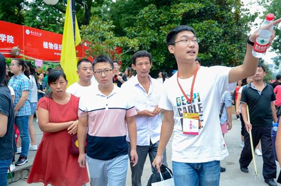 资环学院团委学生会的同学们身着统一会服,由各班同学组成的志愿者团队佩戴志愿者工作牌,每一位志愿者的手腕上绑有一根绿丝带,象征资环的热情活力,大家以饱满的热情和有条不紊的节奏迎接2017届新生的到来。
