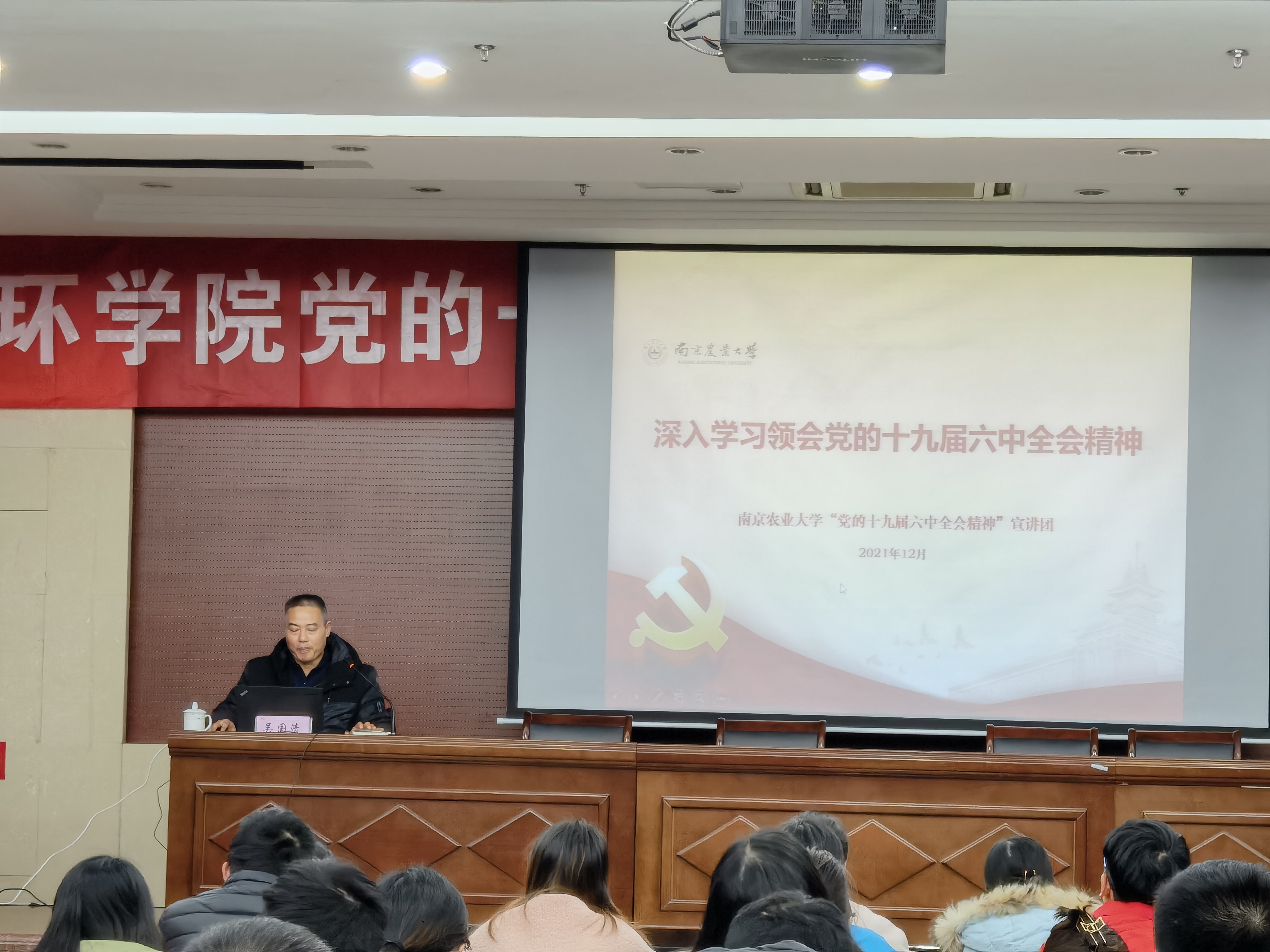 12月22日下午,学校党的十九届六中全会精神宣讲团成员、马克思主义学院吴国清教授作主题宣讲报告。学院党委委员、各党支部书记、支部委员、师生党员代表等参加学习。宣讲会由院党委书记全思懋主持。