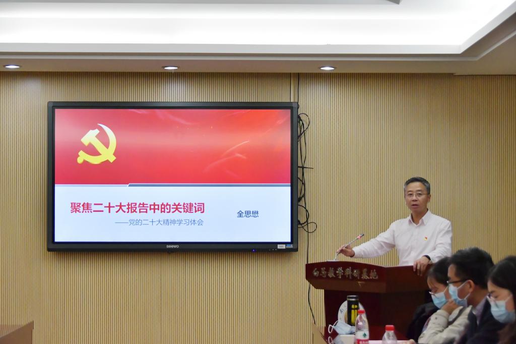 院党委书记全思懋作了题为“聚焦二十大报告中的关键词——党的二十大精神学习体会”的领学报告。他表示,学习党的二十大精神要结合当前我国高等教育和学校、学院的发展实际,把握高校作为科技、人才、创新“三个第一”的交汇点这一最大实际,深入理解“教育、科技、人才是全面建设社会主义现代化国家的基础性、战略性支撑”的深刻含义,主动适应当前高等教育发展的新理念,新格局和高质量发展要求,扎根中国大地、落实立德树人,着力培养符合中国式农业现代化发展要求的新型创新人才。