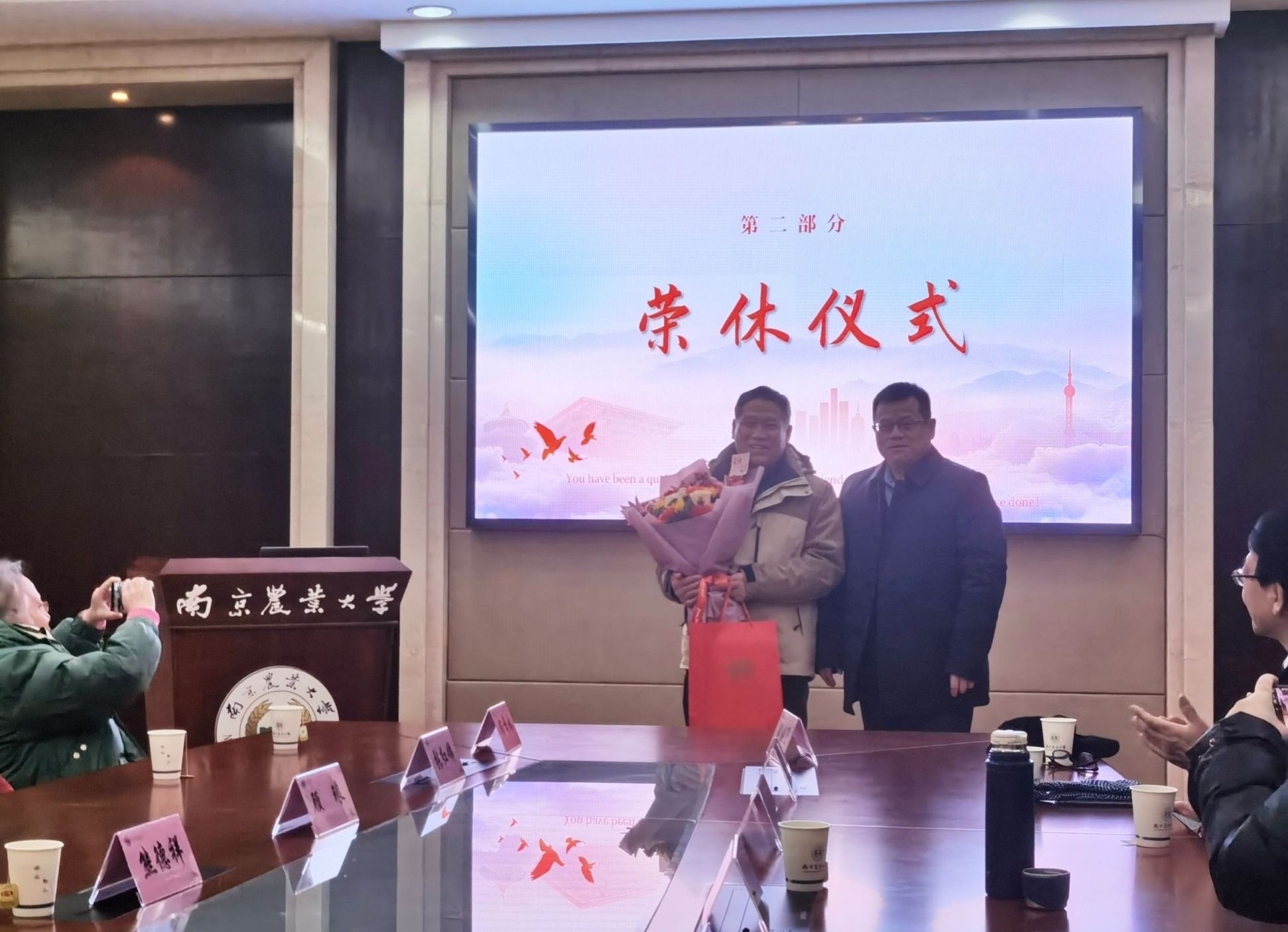 借此次座谈会契机,学院为近期退休的潘剑君教授举行了荣休仪式,祝贺潘老师光荣退休。张瑞福院长代表学院向潘老师送上鲜花和纪念品,对他多年来在学院发展和改革中付出的努力和无私贡献致以崇高的敬意,并衷心祝愿他阖家欢乐、幸福安康。潘剑君老师也发表了退休感言,他回顾了自己的教育生涯,感慨万千。他表示,在学院工作的日子里,感受到了学院大家庭的温暖,他对院领导和同事们的关心表示感谢,一定会一如既往地关注和支持学院的各项工作,为学院的发展建言献策。