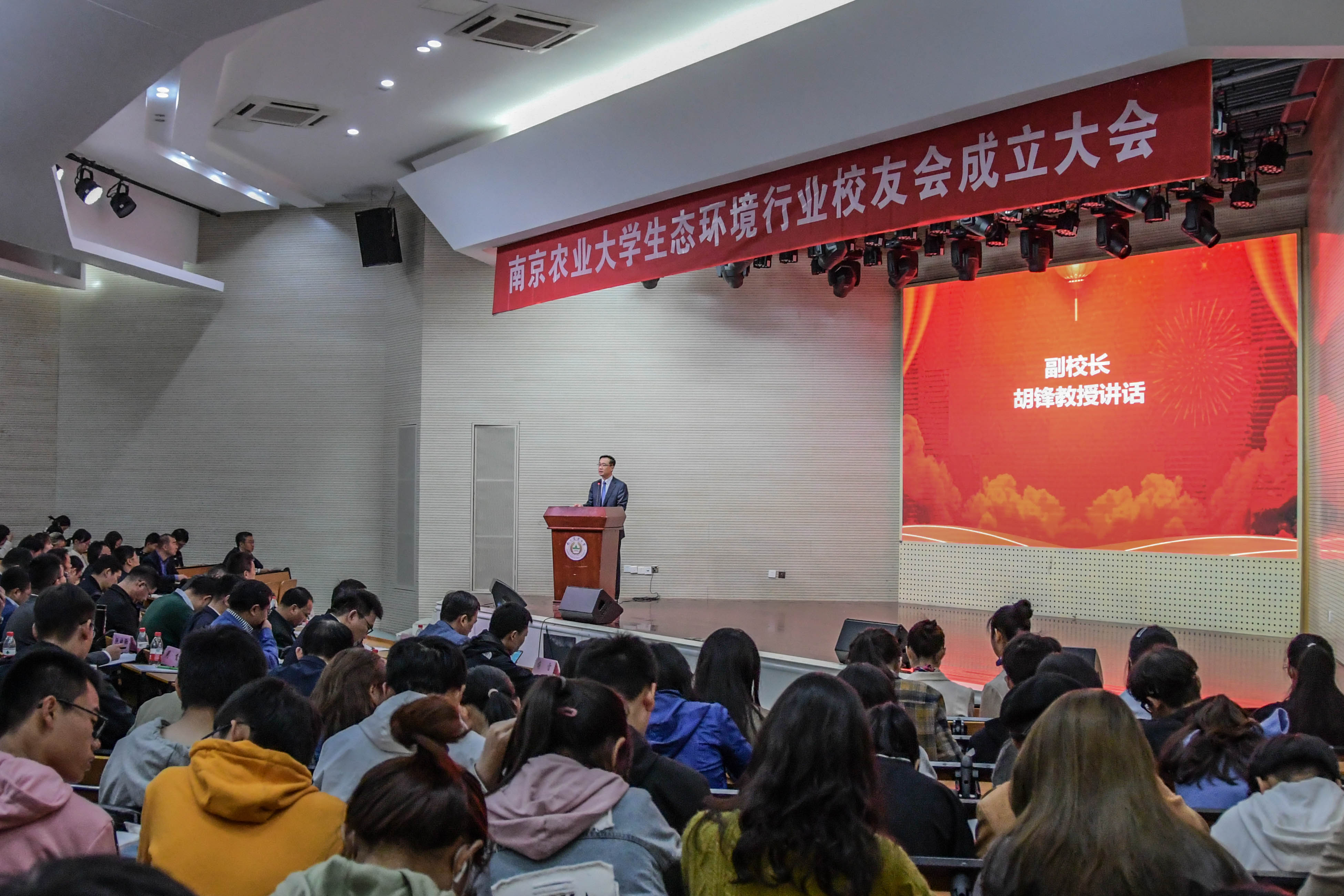 胡锋在讲话中表示,生态环境行业校友会的成立顺应了时代发展要求,响应了党中央加快推进生态文明建设号召,体现了南农校友的对国家生态环境事业的责任担当,是学校校友会工作的重要里程碑。他说,“绿水青山就是金山银山”,广大校友就是学校的绿水青山;“山水林田湖草是生命共同体”,学生、老师、校友和学校命运与共、同根共气。他希望在校师生和广大校友们携手共进,共创美好未来。