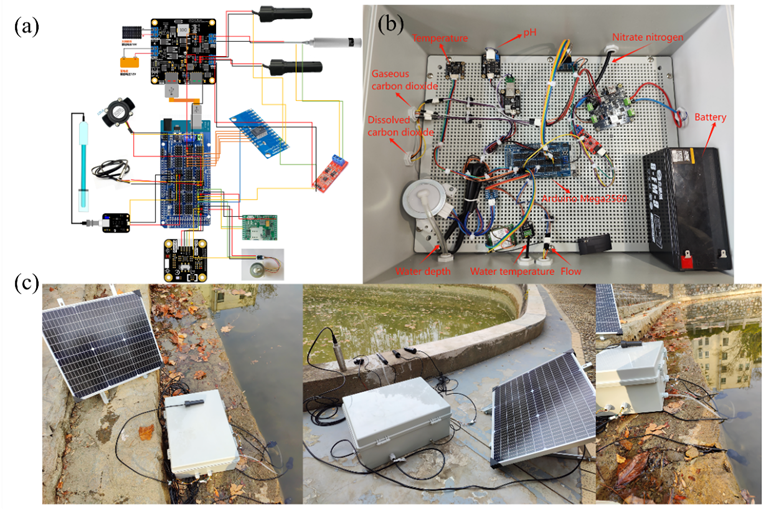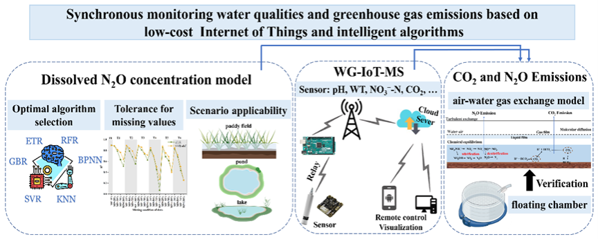 近日,Water Research上发表了题为“Synchronous monitoring agricultural water qualities and greenhouse gas emissions based on low-cost Internet of Things and intelligent algorithms”的研究论文(DOI: 10.1016/j.watres.2024.122663)。我院研究团队开发了一种基于物联网(IoT)和智能算法的水质和温室气体排放同步监测系统(WG-IoT-MS)。该系统配备了低成本传感器并集成了智能算法,能够实时监测溶解的N2O浓度。结合空气-水气体交换模型,该系统实现了对农业水体CO2和N2O排放的有效监测和模拟,并将监测成本降低了约 60%。研究成果为农业水环境和温室气体同步监测提供了一种新思路和新技术。
