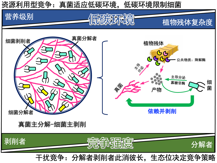 近日,沈其荣院士团队张瑞福教授课题组在Genome Biology上发表了最新研究成果“A novel decomposer-exploiter interaction framework of plant residue microbial decomposition”。该研究通过模拟不同复杂度的植物残体分解环境,结合传代演化实验、多组学分析、系统生物学模拟和合成微生物群落实验,系统揭示了细菌与真菌在植物残体分解过程中的生态角色分化及互作机制,提出了“真菌主分解-细菌主剥削”的互作模型。该研究不仅深化了我们对碳循环微生物生态学的理解,也为秸秆还田和土壤有机质提升技术措施提供了理论支撑。该研究发现:1)植物残体复杂度驱动真菌和细菌群落差异演化。真菌高度适应不同复杂度植物残体分解,随残体复杂度增加,真菌群落丰富度上升,而细菌群落丰富度则急剧下降。2)植物残体分解遵从“真菌主分解,细菌主剥削”互作框架。不同复杂度植物残体分解中,真菌群落主导残体分解核心基因的表达,向促分解的方向演化;而细菌群落则主导寡糖苷酶等基因表达,通过剥削真菌分解产物以维持生存。3)可利用碳源种类与浓度参与细菌整体群落的结构塑形。植物残体复杂度营造了养分梯度变化,细菌群落的多碳源利用能力发挥关键作用,在低碳环境下通过摄取更多类型碳源以维持生存,但交叉互养作用在碳源浓度进一步降低时受限,无法支撑群落稳定生长。4)真菌分解者赋予细菌演化中剥削者盛行的群落结构。不同复杂度植物残体分解中,细菌分解者相对于细菌剥削者具有显著生存优势。然而,真菌分解者具有重塑细菌群落碳源获取策略的能力,从而推动细菌剥削者在群落中的盛行。5)次代产物介导的竞争性互作强化“分解者-剥削者”模型。植物残体复杂度营造的养分梯度差异下,营养越匮乏细菌竞争越弱,相反则驱动更强的真菌竞争。分解者与剥削者竞争强度此消彼长,生态位差异决定微生物竞争策略。
