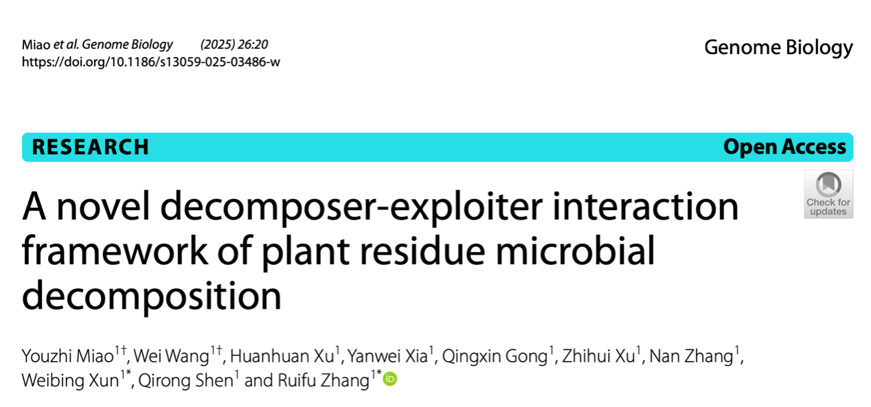 学院副教授缪有志为论文第一作者,张瑞福教授为论文通讯作者。实验室在读博士生王伟和课题组荀卫兵副教授分别为该论文共同一作和共同通讯。沈其荣院士为本研究提供了指导。该研究得到国家重点研发青年科学家项目(2021YFD1900300和2024YFD1701600)、国家自然科学基金(42477126)和江苏省自然科学基金(BK20231472)的资助。