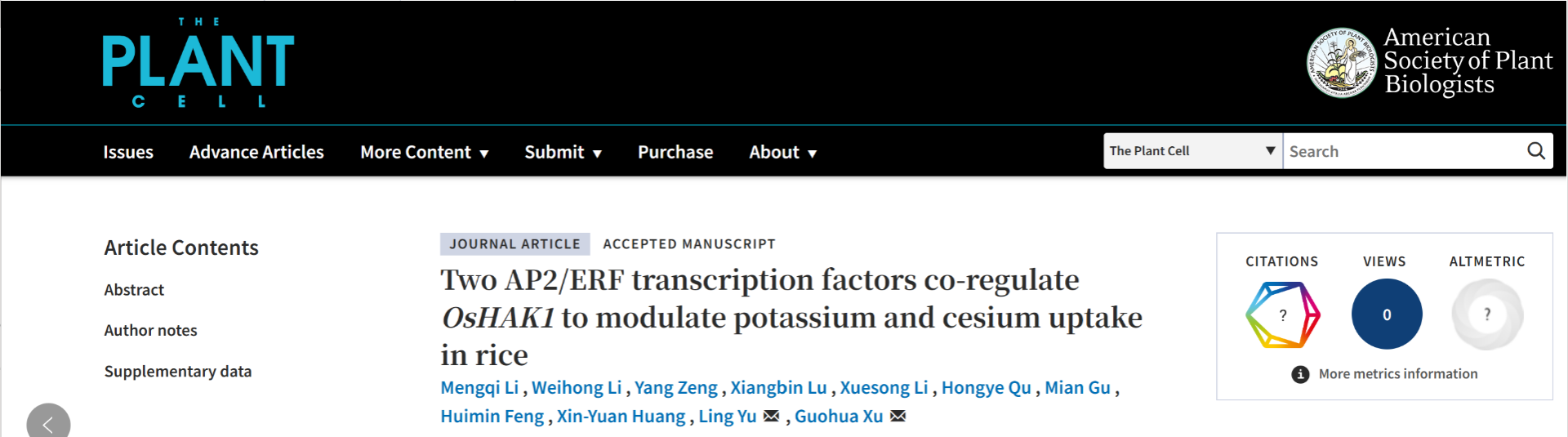 近日,ios版雷竞技官网资源与环境科学学院徐国华教授团队在植物学顶级期刊《The Plant Cell》在线发表了题为“Two AP2/ERF transcription factors co-regulate OsHAK1 to modulate potassium and cesium uptake in rice”的研究论文。该研究首次揭示了一对功能相互拮抗的AP2/ERF转录因子通过协同调控OsHAK1的表达,动态平衡水稻对钾和铯的吸收过程。