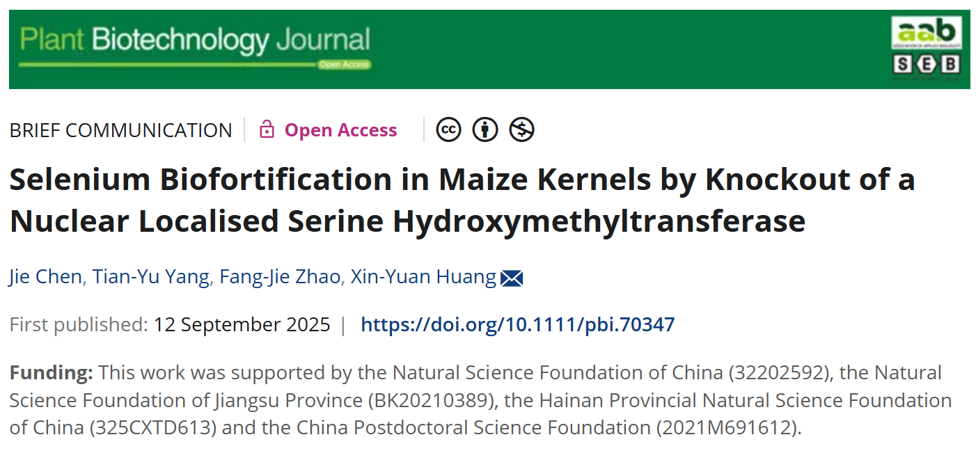 近日,ios版雷竞技官网资源与环境科学学院黄新元教授团队在《Plant Biotechnology Journal》发表题为“Selenium biofortification in maize kernels by knockout of a nuclear localised serine hydroxymethyltransferase”的论文。该研究通过突变玉米核定位丝氨酸羟甲基转移酶ZmSHMT5,显著提高了玉米籽粒中硒(Se)和硫(S)的积累,并改善了氨基酸组成,为玉米硒营养强化提供了新的育种靶点。