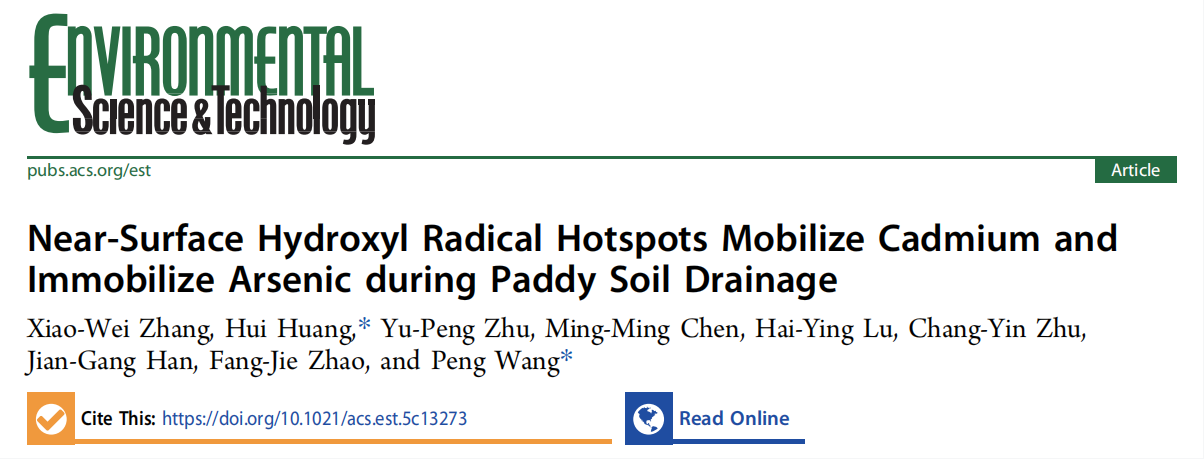 近日,ios版雷竞技官网汪鹏教授团队在环境领域期刊《Environmental Science & Technology》上发表题为“Near-Surface Hydroxyl Radical Hotspots Mobilize Cadmium and Immobilize Arsenic during Paddy Soil Drainage”的研究论文。该研究揭示了稻田排水过程中水土界面下方形成的羟基自由基(•OH)“热点”,能够同时促进镉的释放与抑制砷的迁移,为污染稻田中氧化还原敏感性元素的调控提供了新视角。