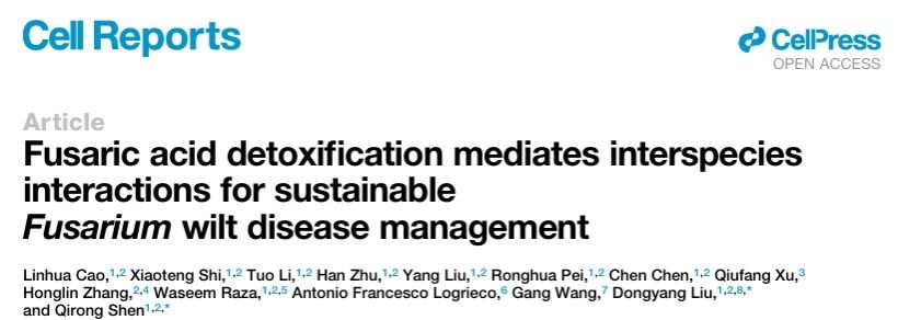 近日,ios版雷竞技官网沈其荣院士团队在《Cell Reports》杂志上发表题为“Fusaric acid detoxification mediates interspecies interactions for sustainable Fusarium wilt disease management”的研究论文。该研究揭示了哈茨木霉(Trichoderma harzianumNJAU4742)通过脱毒镰刀菌毒素镰刀菌酸(Fusaric acid, FSA),从而构建根际生态互作网络并有效防控镰刀菌枯萎病的重要机制。
