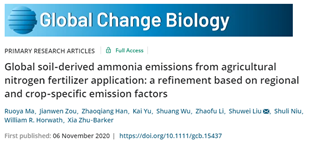 近日,我校资环学院邹建文教授课题组通过对全球来自于324篇文献的4590组原位观测资料的集成与定量估算研究,辨析了全球不同氮肥管理生态系统氨排放系数的差异性特征,采用基于区域和不同作物类型的具体排放因子估算了全球农业氮肥施用的氨排放总量。相关研究结果以“Global soil-derived ammonia emissions from agricultural nitrogen fertilizer application: a refinement based on regional and crop-specific emission factors”为题于11月6日发表在国际全球变化研究领域权威学术期刊《全球变化生物学》(Global Change Biology)上。课题组博士生马若亚和邹建文教授为论文共同第一作者,刘树伟教授为通讯作者,课题组博士生韩召强、余凯和吴双博士,资环学院李兆富教授,中科院地理所牛书丽研究员,美国加州大学戴维斯分校(UC Davis)William R. Horwath和Xia Zhu-Barker教授参与了该项研究。该研究得到国家自然科学基金、国家重点研发专项和人才支持项目等资助。
