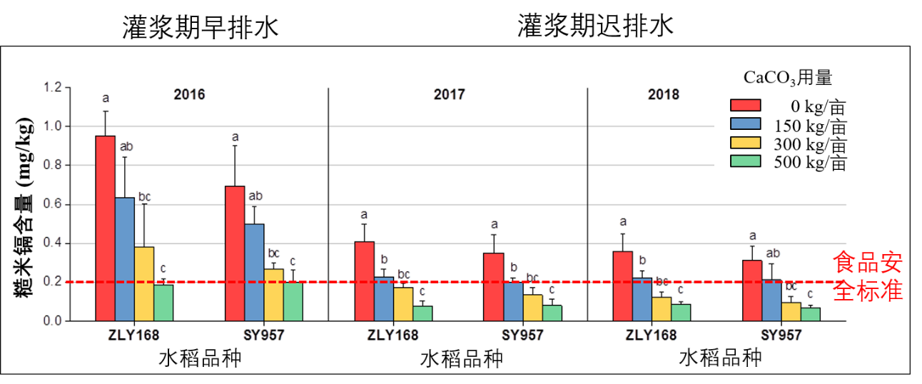 图2.施用石灰对两个水稻品种籽粒镉含量的影响(大田试验)。土壤镉含量为0.67 mg/kg,土壤起始pH为5.5,一次性施用500 kg CaCO3/亩提高土壤pH至6.5,降镉效果持续多年。