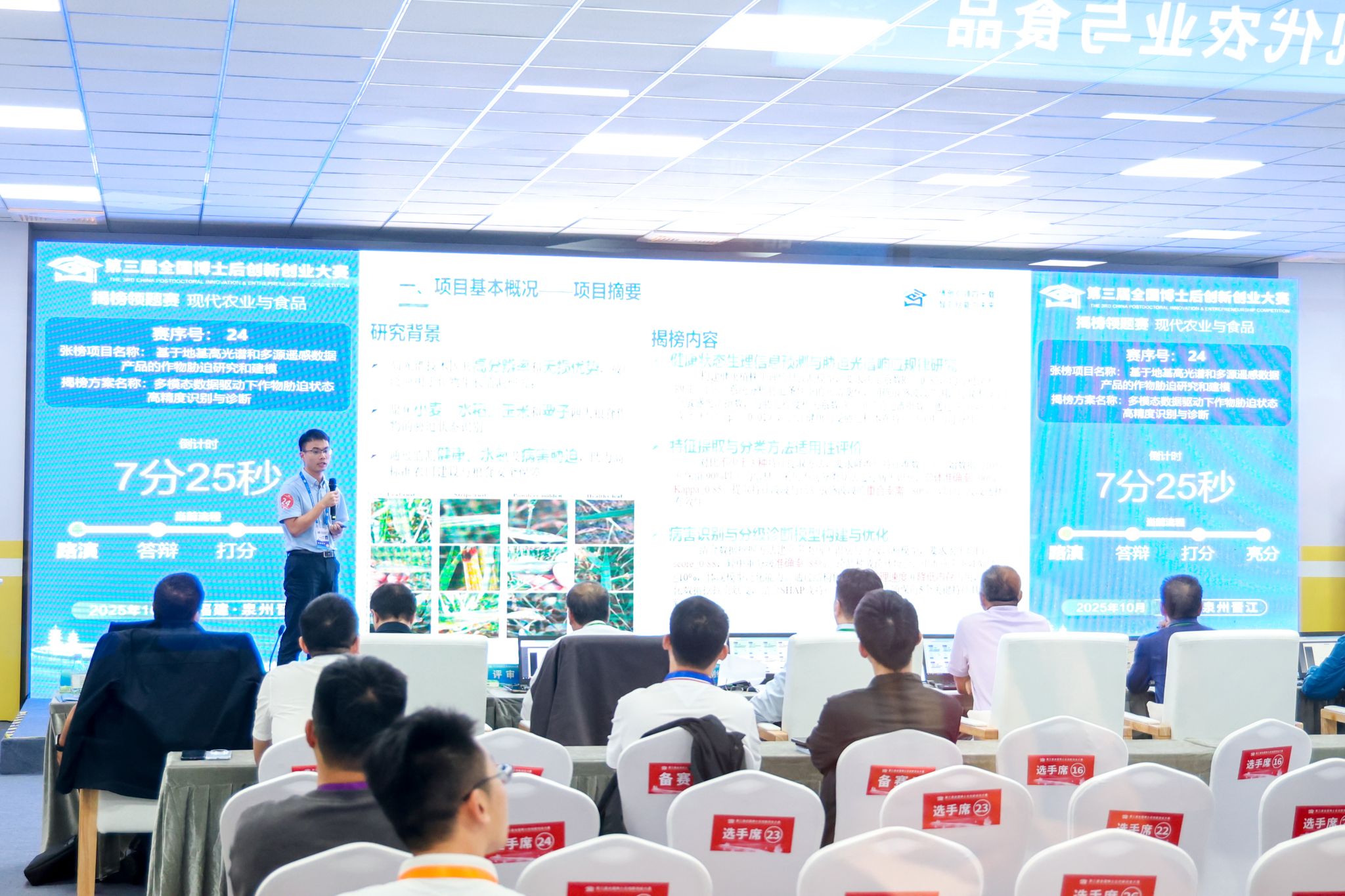 农学院李伟团队的参赛项目是“多模态数据驱动下作物胁迫状态高精度识别与诊断”。该项目的研究源于国家对智慧农业发展的重大需求。团队致力于利用高光谱技术对中国粮食作物(小麦、水稻、玉米和粟子)的生长胁迫状态进行精准识别与诊断,围绕抗田间干扰因素的敏感光谱指数构建、作物胁迫发生光谱敏感特征提取与筛选、作物胁迫状态识别和诊断模型构建三个方面开展研究,解决传统监测方法效率低、准确性不足的问题。最终,李伟团队的参赛项目从48个参赛项目中脱颖而出,获得银奖,也是江苏省博士后代表队在揭榜领题赛道现代农业与食品组获得的唯一一个银奖。