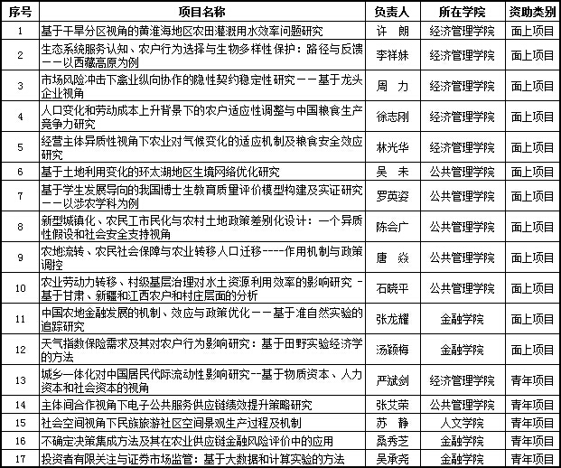本次所获项目具有以下两个显著特点,反映出我校人文社科的良好发展态势:一是分布广,除了传统优势学院的经管学院、公管学院外,此次金融学院获得四项增速最快,人文学院也首次获得国家自然科学基金立项;二是领域宽,本次所获项目的学科不仅包括农林经济管理、土地资源管理等我校优势学科,教育经济管理、地理学、管理科学与工程等新兴学科也有斩获。