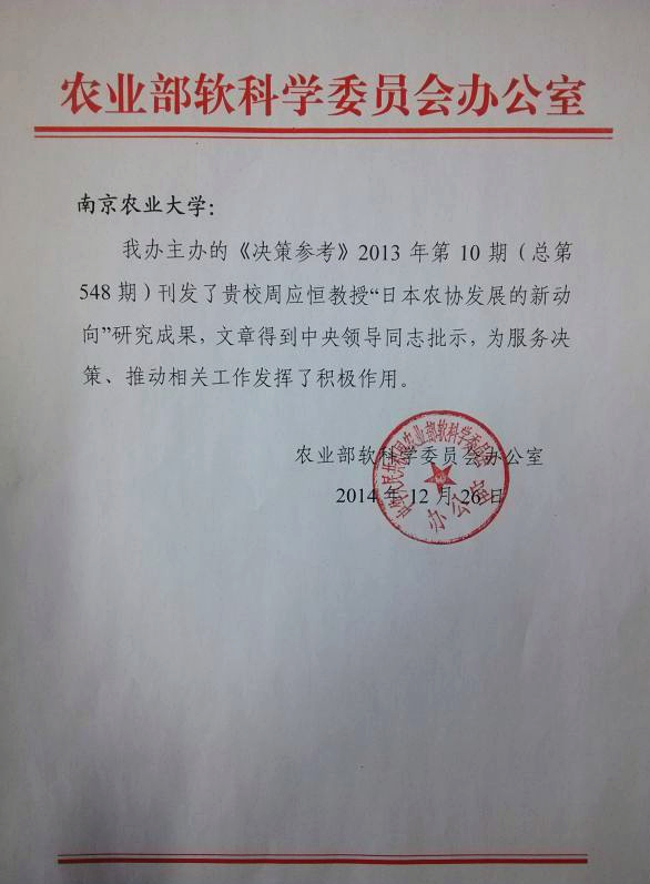 近日,接农业部软科学办公室公函,我校周应恒教授学术团队的科研成果《日本农协发展的新动向》获中央领导批示。