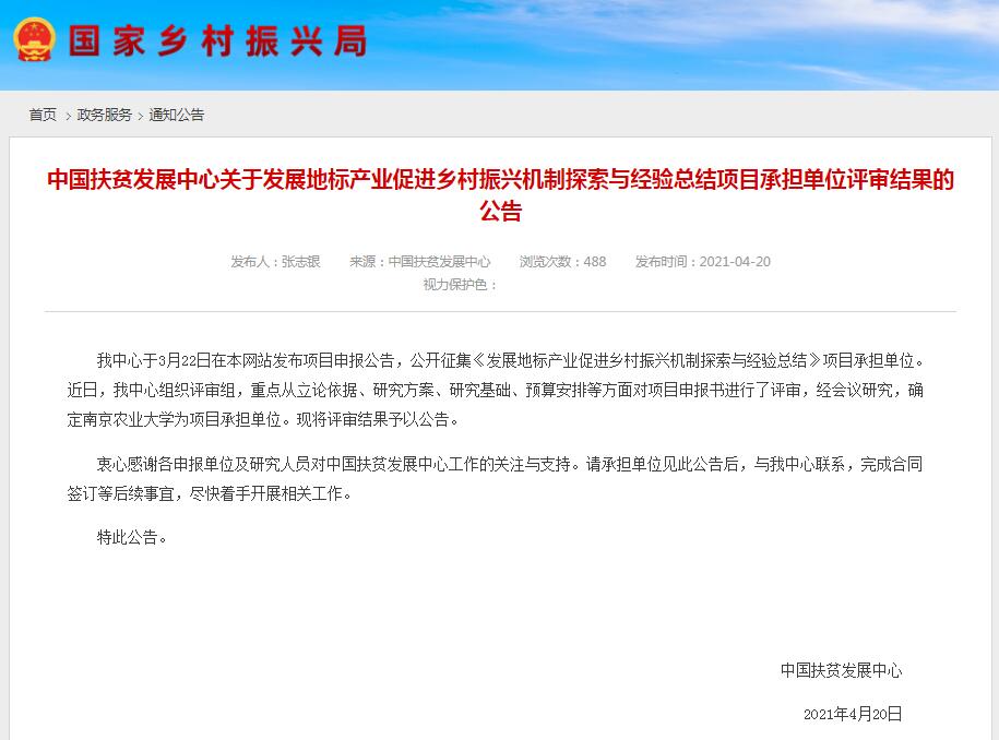 4月20日,从国家乡村振兴局网站获悉,我校中国地标文化研究中心在国内诸多竞标单位中脱颖而出,成功中标国家乡村振兴局公开招标的《发展地标产业促进乡村振兴机制探索与经验总结》项目。