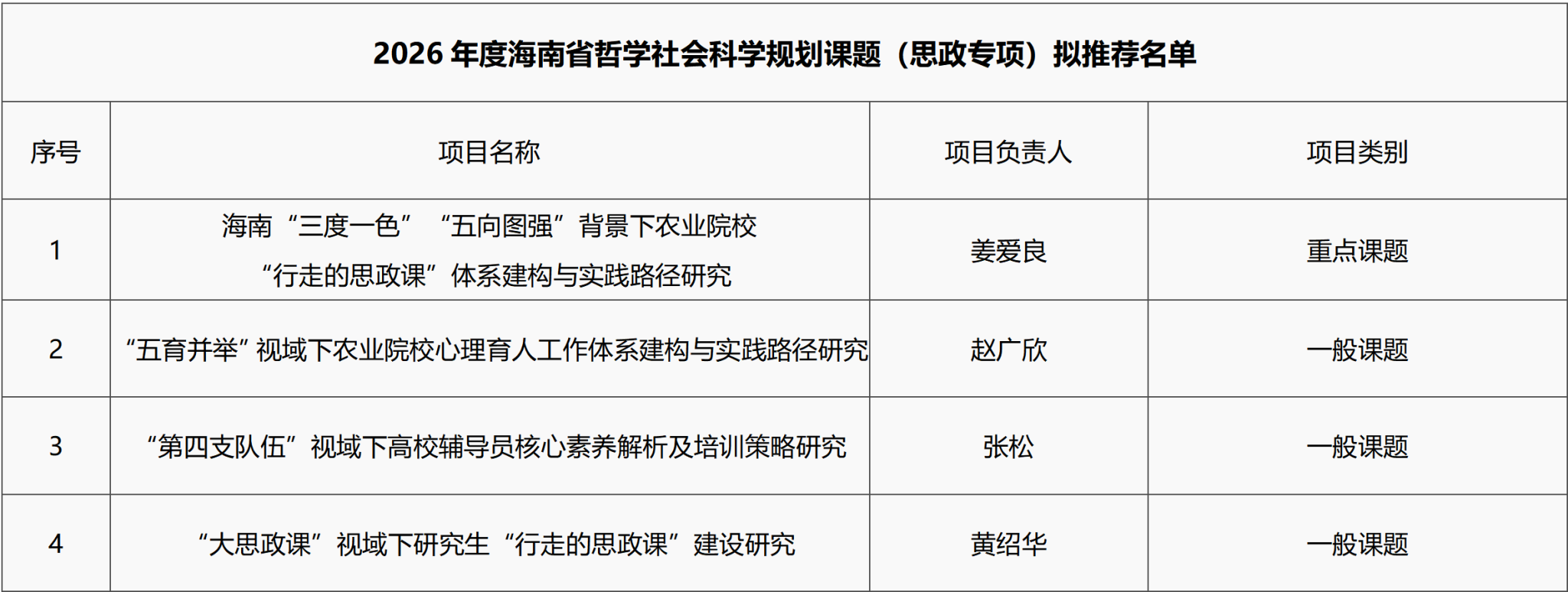 根据海南省教育厅、海南省社会科学界联合会下发的《关于申报2026年度海南省哲学社会科学规划课题(思政专项)的通知》,收到重点课题1项、常规课题(一般课题)3项。