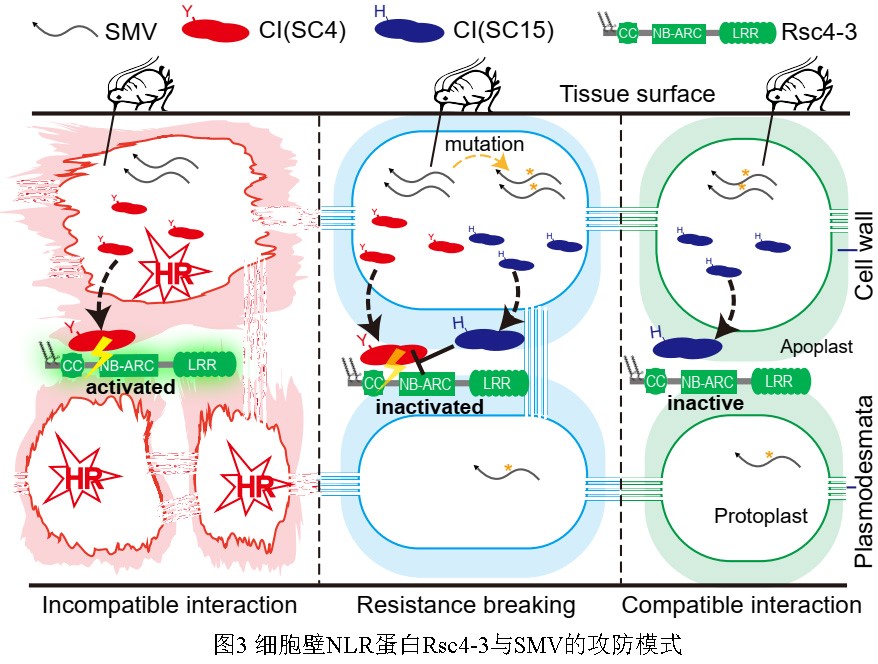 该研究通过不同株系的SMV基因组片段重组实验和单病毒基因诱发Rsc4-3介导的免疫反应实验,发现Rsc4-3识别的无毒基因是SMV编码的CI蛋白(图2);虽然CI蛋白在细胞内外都有分布,但Rsc4-3只在胞外通过直接互作识别分布在胞外的CI蛋白引发抗病反应。通过进一步氨基酸点突变,发现了CI第572个氨基酸的变异决定SMV的毒性,CI的572位酪氨酸(Y)突变为组氨酸(H)或谷氨酰胺(Q)会导致Rsc4-3的抗性丧失。SC15株系的毒性CI可以抑制SC4株系的无毒CI所诱发的Rsc4-3介导的抗病反应,田间无毒和有毒株系混合侵染时,有毒株系表现上位性,这也给大豆抗SMV育种带来挑战。该研究揭示了大豆与大豆花叶病毒攻防机制(图3),为大豆SMV防控奠定了基础。