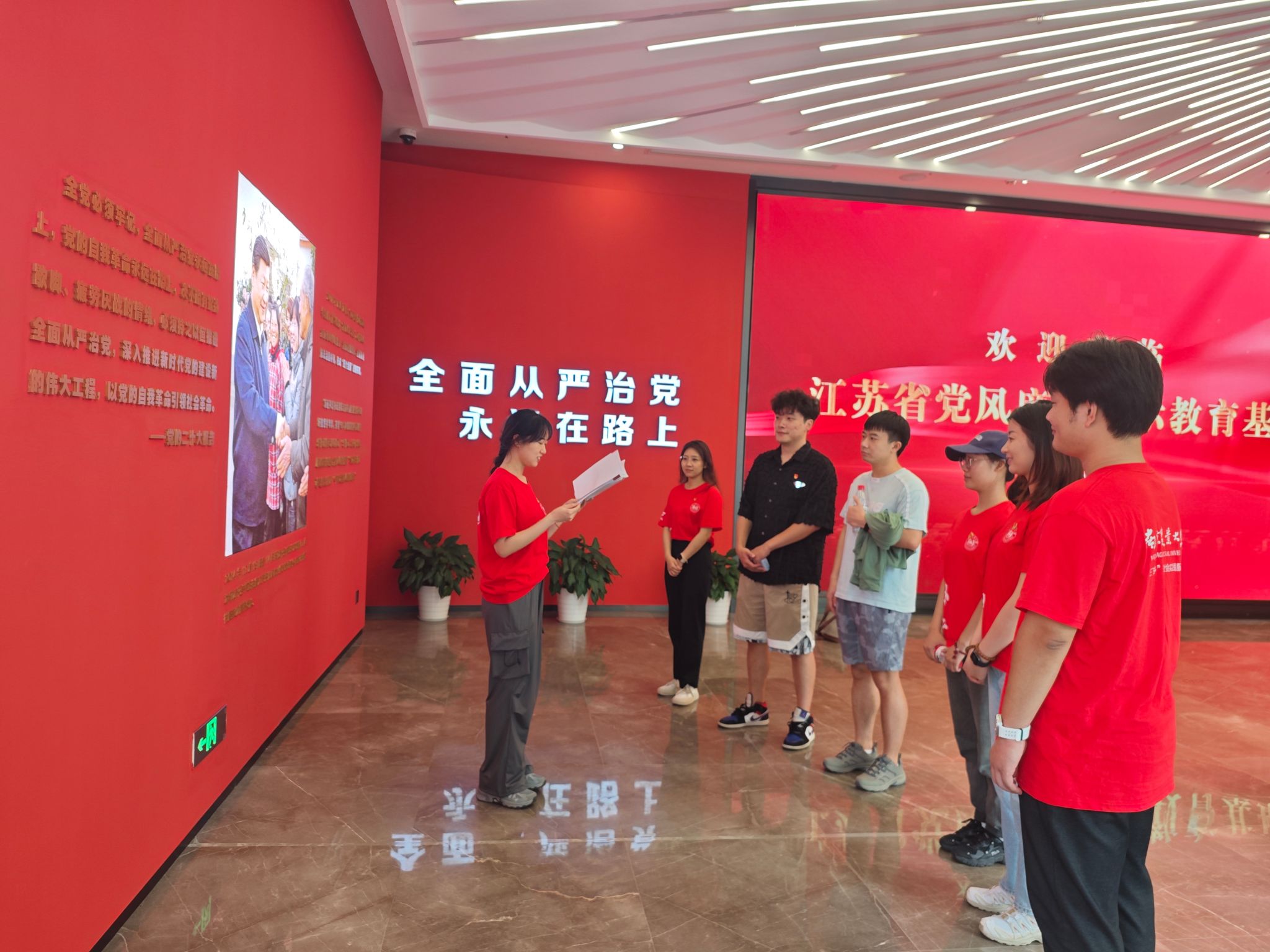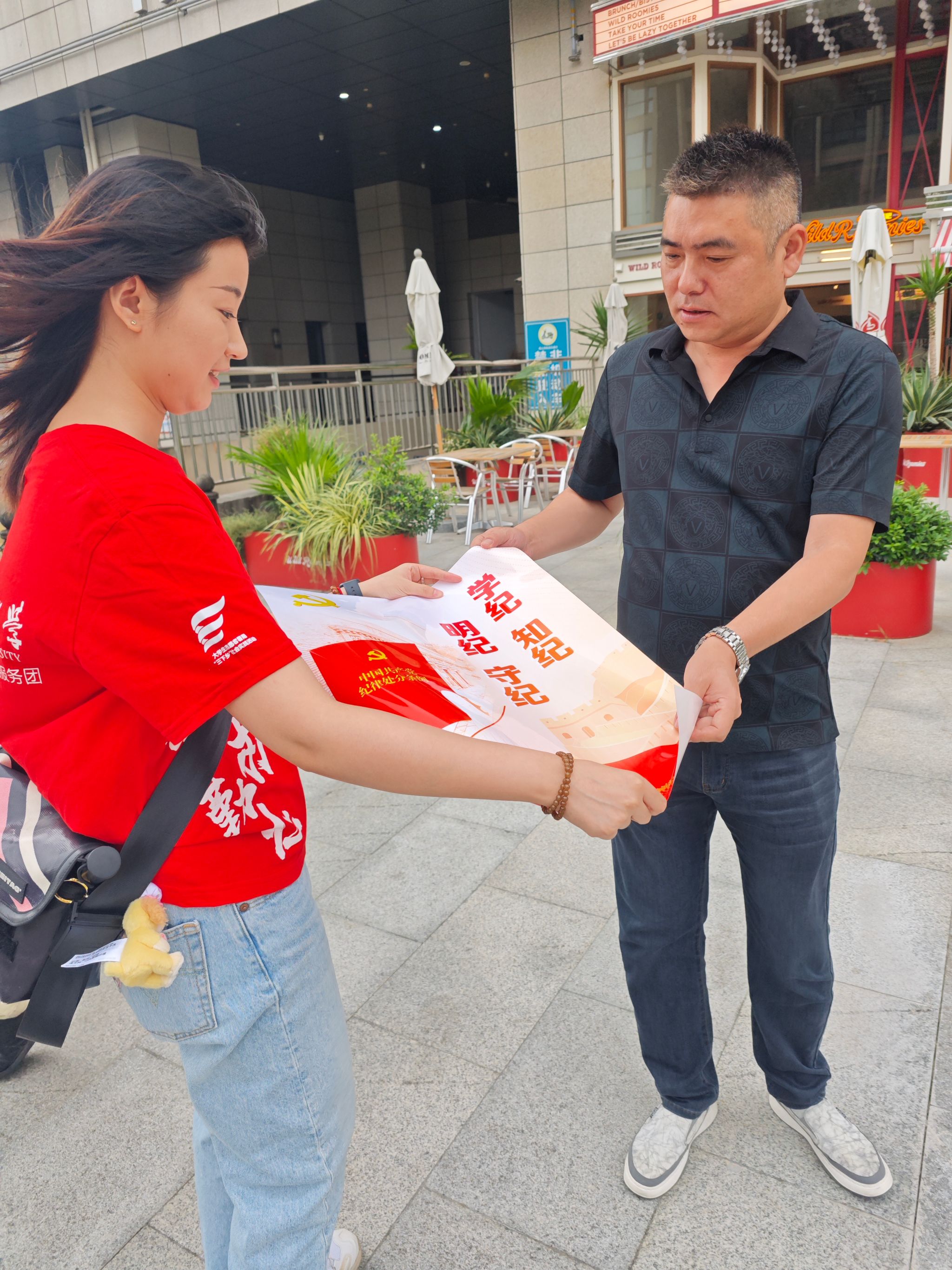 团队成员在江苏省党风廉政警示教育基地周围开展党纪学习教育宣传,为群众发放党纪主题教育海报,与周边群众开展交流讨论。