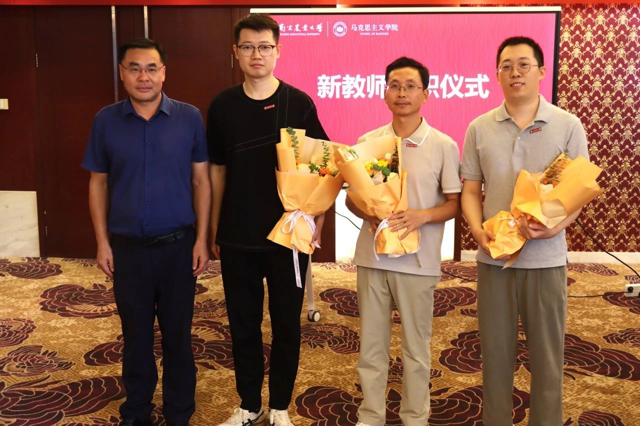 新教师入职仪式上,付坚强为李辉、王豪杰、王欢三位新教师佩戴校徽。新教师们表示,南农马院将是新的起点,在今后的工作中将把握好方向,站稳讲台、站好讲台,努力在教书育人和科研创新上取得优秀业绩。