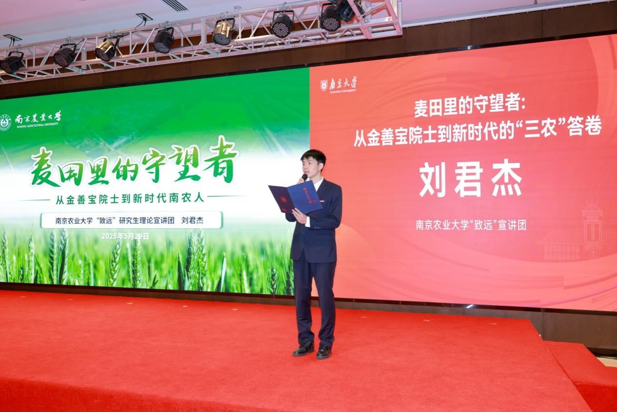 联盟启动仪式结束后,来自省内八所高校的理论宣讲团队围绕“精神如炬,照亮奋进前路”“自立自强、传承报国初心”“向光而行,奔赴理想征程”三个篇章进行示范宣讲,我院宣讲团成员刘君杰作《麦田里的守望者——从金善宝院士到新时代南农人》主题宣讲。