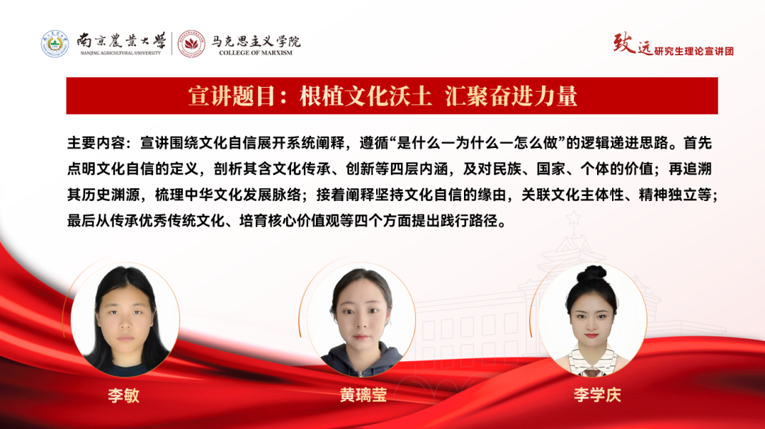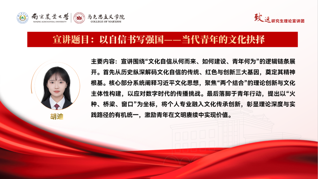 宣讲围绕“文化自信从何而来、如何建设、青年何为”的逻辑链条展开。首先从历史纵深解码文化自信的传统、红色与创新三大基因,奠定其精神根基。核心部分系统阐释习近平文化思想,聚焦“两个结合”的理论创新与文化主体性构建,以应对数字时代的传播挑战。最后落脚于青年行动,提出以“火种、桥梁、窗口”为坐标,将个人专业融入文化传承创新,彰显理论深度与实践路径的有机统一,激励青年在文明赓续中实现价值。