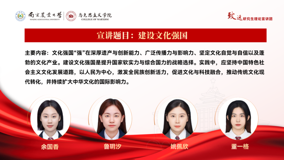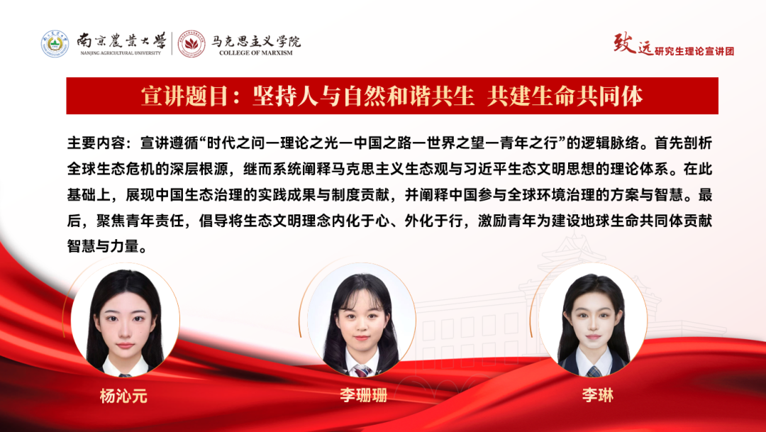 宣讲以“传承南农红色基因,践行强农兴农使命”为目标展开。由习近平总书记的重要论述引入,点明红色校史的精神价值;回溯历史,从南农先贤舍生取义、为民担当、献身科学等故事中,提炼“爱国赤诚、为民情怀”等红色基因内核;讲述新时代南农人的接续奋斗、为建设中国特色社会主义现代化强国贡献南农智慧、南农科技与南农力量;号召南农人承红色之魂,续写强农新篇。