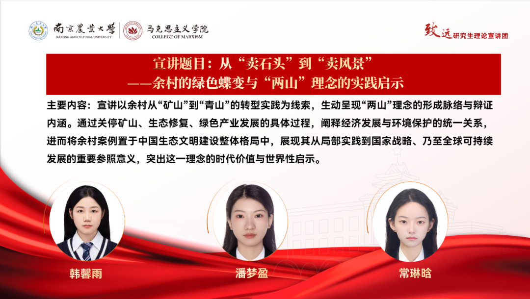 宣讲以余村从“矿山”到“青山”的转型实践为线索,生动呈现“两山”理念的形成脉络与辩证内涵。通过关停矿山、生态修复、绿色产业发展的具体过程,阐释经济发展与环境保护的统一关系,进而将余村案例置于中国生态文明建设整体格局中,展现其从局部实践到国家战略、乃至全球可持续发展的重要参照意义,突出这一理念的时代价值与世界性启示。