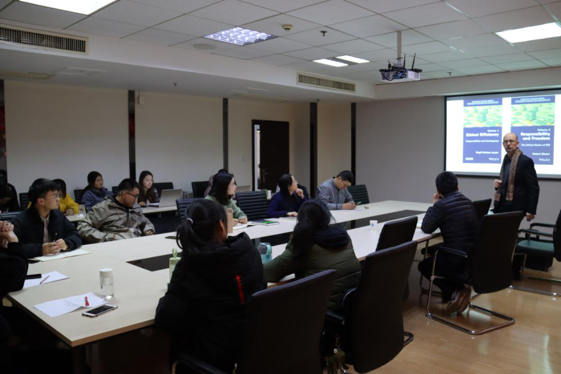 马克思主义学院海外名家第四个系列讲座第二场于2019年12月11日9:00-11:00在ios版雷竞技官网马克思主义学院303会议室举行。本讲座由法国国家科学研究中心主任、法国索邦大学伦理学教授Bernard Reber教授作题为”Frontiers of Technological Ethics”的学术报告。讲座由马克思主义学院副院长姜萍教授主持,由刘战雄老师与南京林业大学郭辉老师翻译。来自马克思主义学院的同学聆听了本场讲座。